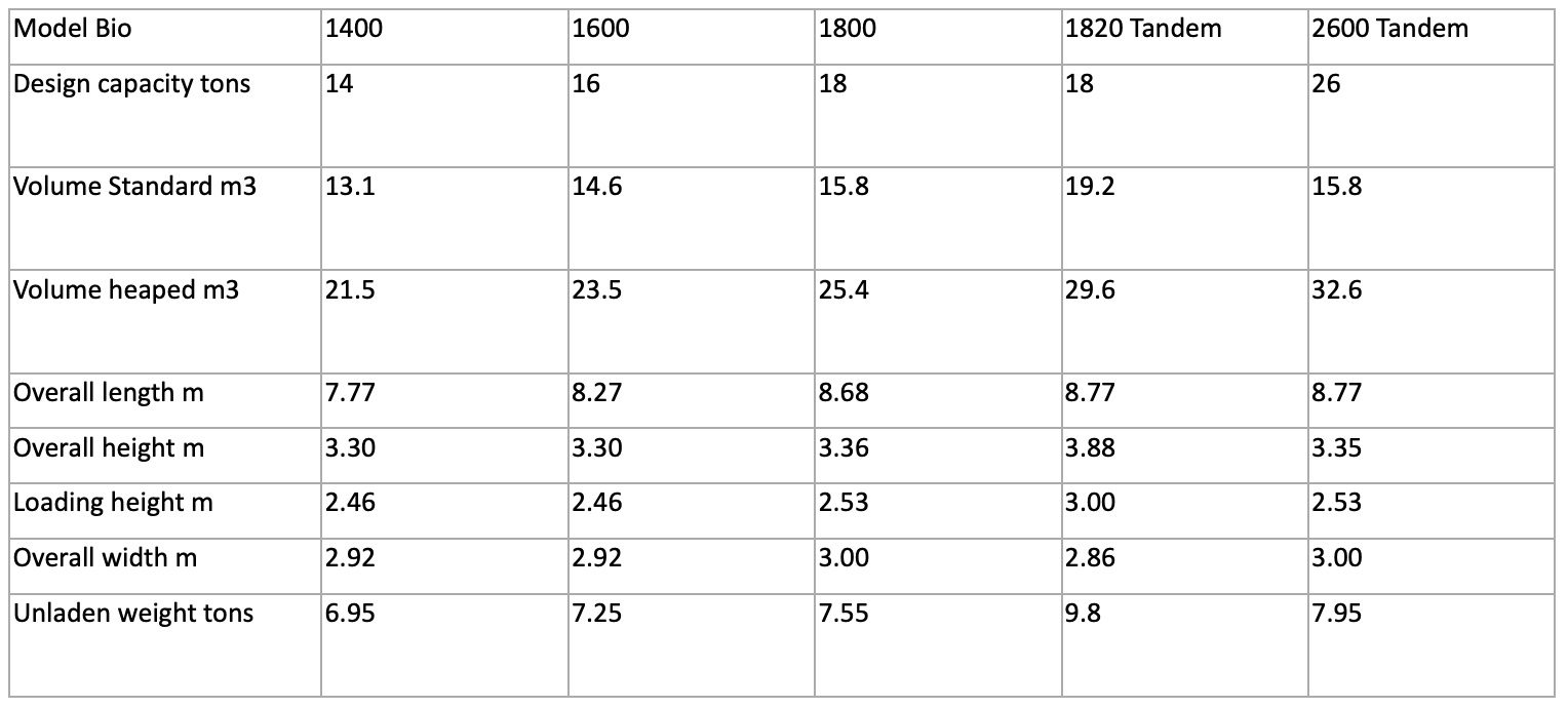 All bio spreaders come standard with sprung drawbar, larger tyres with the 1100 and 1200 have 520/85 R38 as standard, while the 1400 has 580/70 R38, hydraulic slurry door, hydraulic opening rear hood and electronic in cab control of the floor speed as standard.